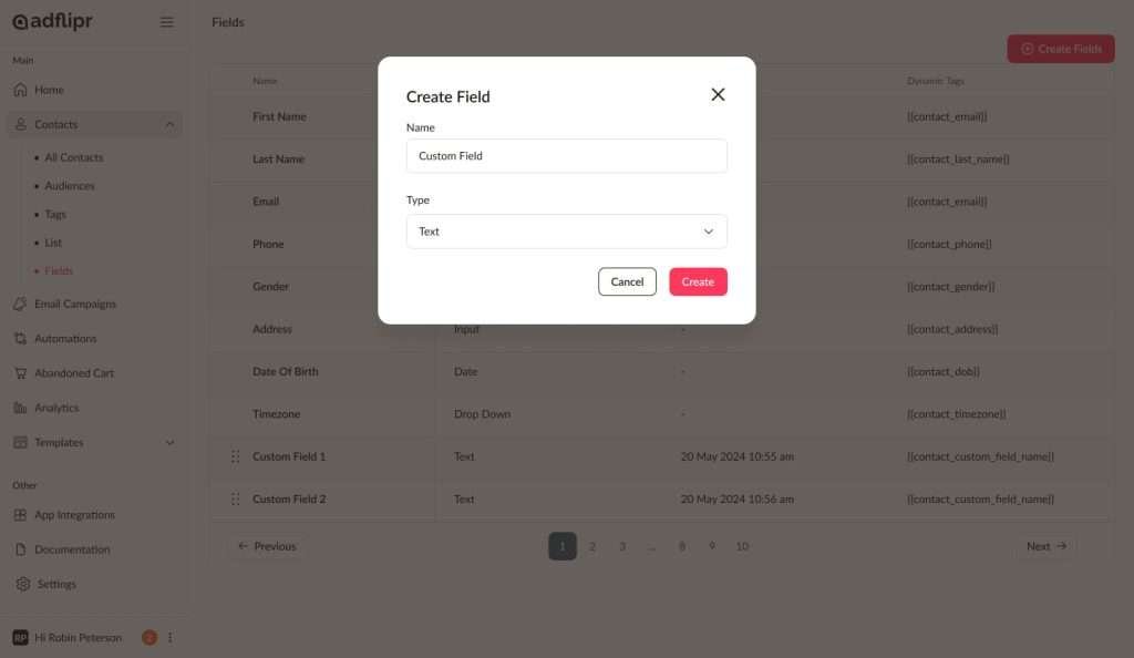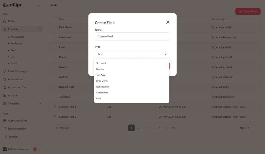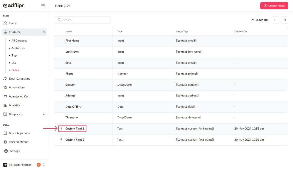 Navigate to Contacts > Fields to view all the fields you’ve created in AdFlipr.
